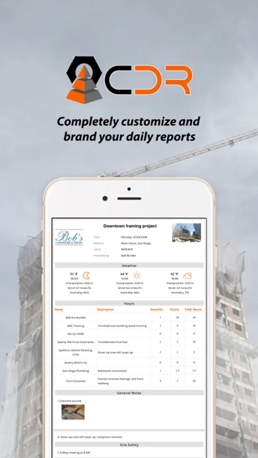 Want to save an hour a day on those pesky daily reports? CDR - Construction Daily Reports is the fastest and easiest custom daily reporting solution for the construction industry. Customize your reports, enter your project details, then take pictures and notes through your mobile device. At the end of the day when you sign your finished report, CDR will automatically email your report in professional PDF format to anyone you select while saving it on our servers and uploading to your cloud storage service!