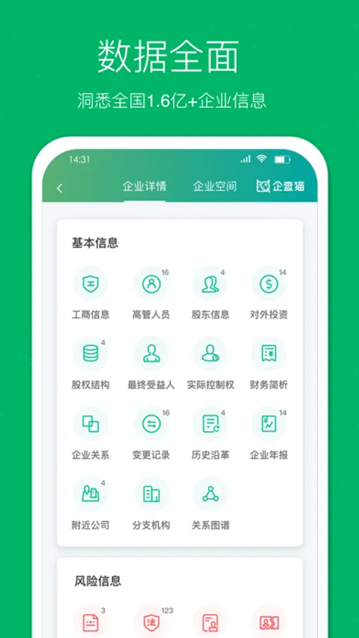 企业查询:支持企业名或人名等关键字的智能搜索,可一键查企业、查老板。