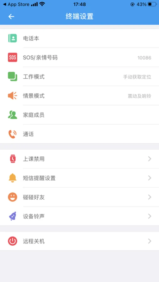 10 设置: APP 可以设置 SOS/亲情号码,设备工作模式, 免打扰模式等
