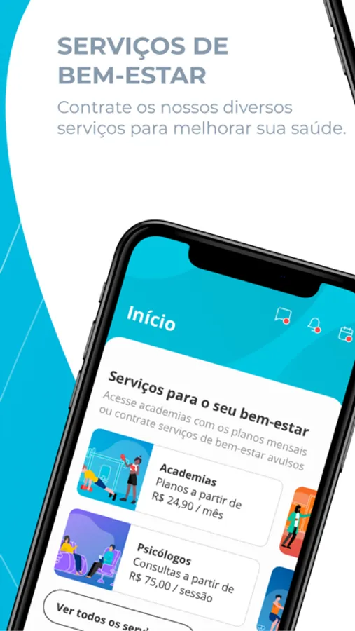 - Contrate sessões com psicólogos, nutricionistas e personal trainers por preços acessíveis;