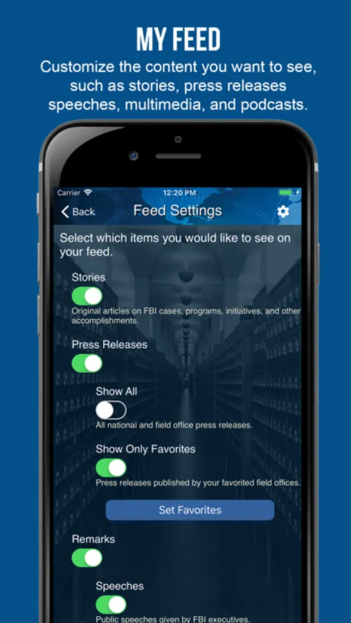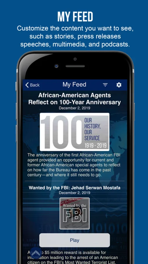 • Customize your news feed with any combination of the latest FBI videos, photos, stories, press releases, speeches, testimonies, and podcasts.