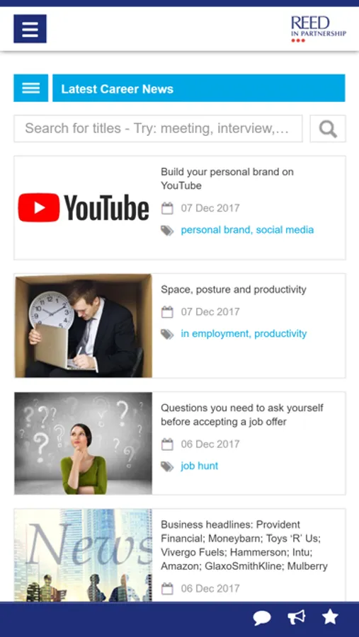 The Reed in Partnership app connects to your existing Reed in Partnership Online Portal account and allows you to access support with finding and staying in work on the go. Everything you do on the app is in sync with your Online Portal account and you always have access to the latest career tools, news and resources.