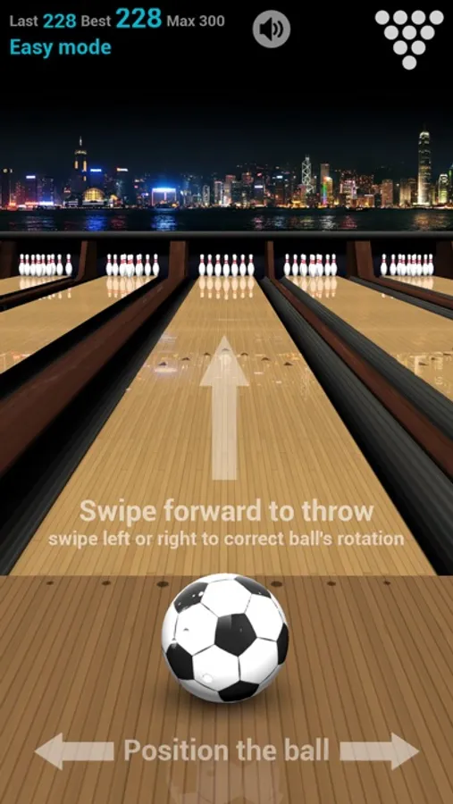 * Slide your finger on the screen from the starting line towards the pins (the speed is not important, what matters are the touchpoint and the drop-out). The longer the distance is between the first contact and drop-out, the faster the ball goes.