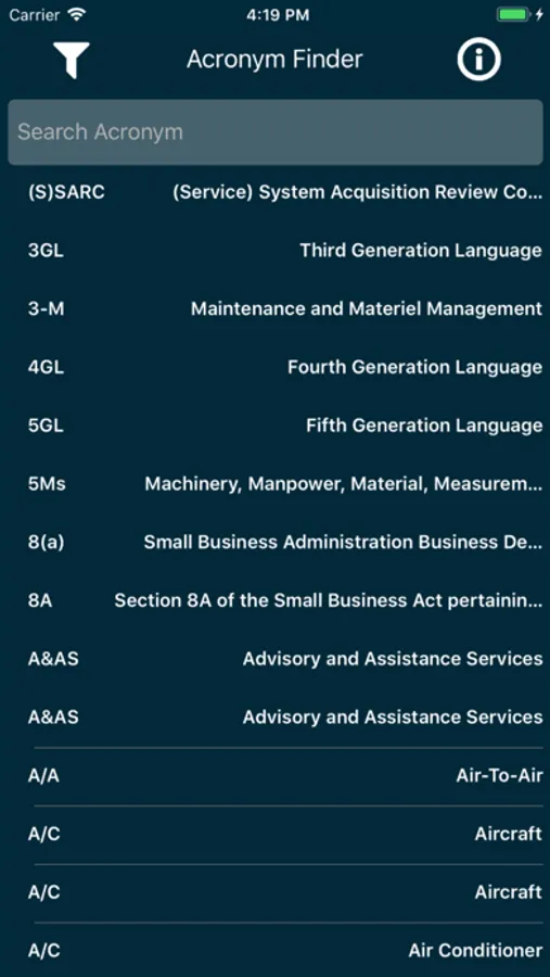 NAVAIR Acronym Finder gives users a quick way to lookup NAVAIR acronyms that are used in their day-to-day work environments. Users will have the ability to filter down to a particular source of an acronym list in order to make searching more precise and relevant.