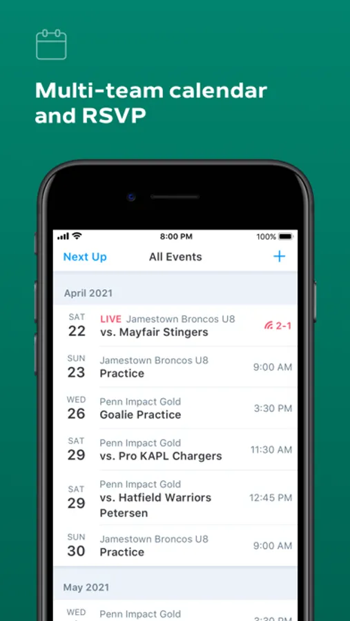SCHEDULING & CALENDAR SYNC: Maintain a single, easy-to-manage team calendar to keep coaches, parents, and players on the same page all season long. Sync with your existing online/mobile calendar to track your teams’ schedules in one place.