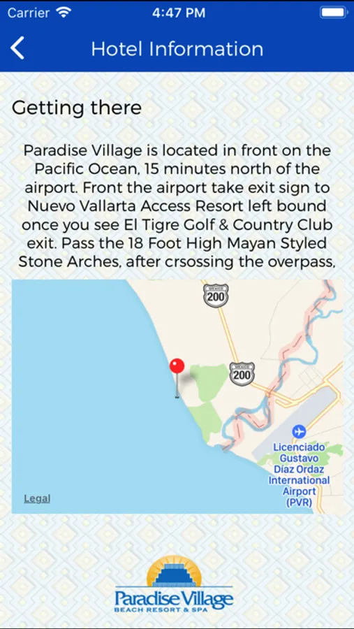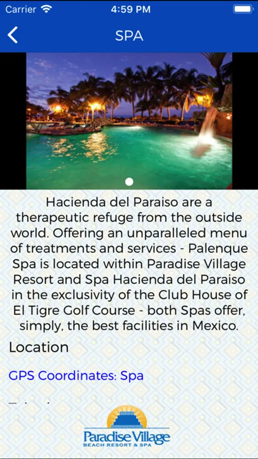 The use of this mobile application is ruled by the terms of use of Paradise Village Beach Resort and Spa. For more information, visit http://www.paradisevillage.com/privacypolicy.html
