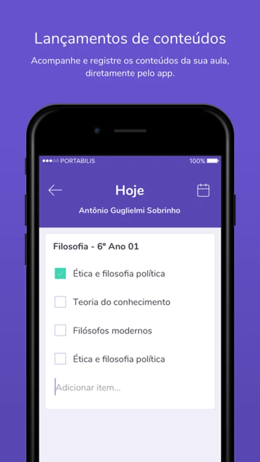 Acompanhe e registre os conteúdos da sua aula diretamente pelo app. Uma maneira simples de verificar os conteúdos ministrados em sala de aula.