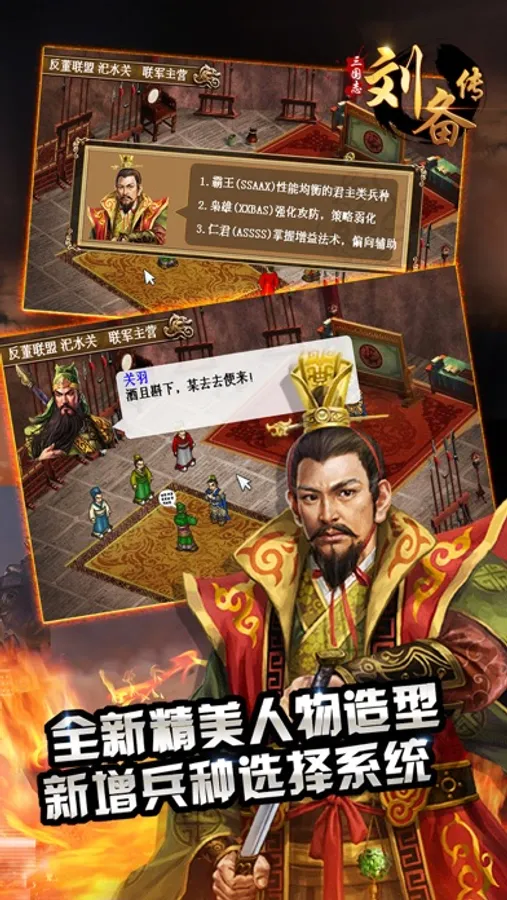 《三国志刘备传》中设有大量经典关卡,并且设置大量经典兵种和经典道具。让您在游戏中回味无穷。每个关卡都值得您回味!游戏采用了全新人物形象及战场地图等美术素材,让经典关卡展现出全新的魅力。