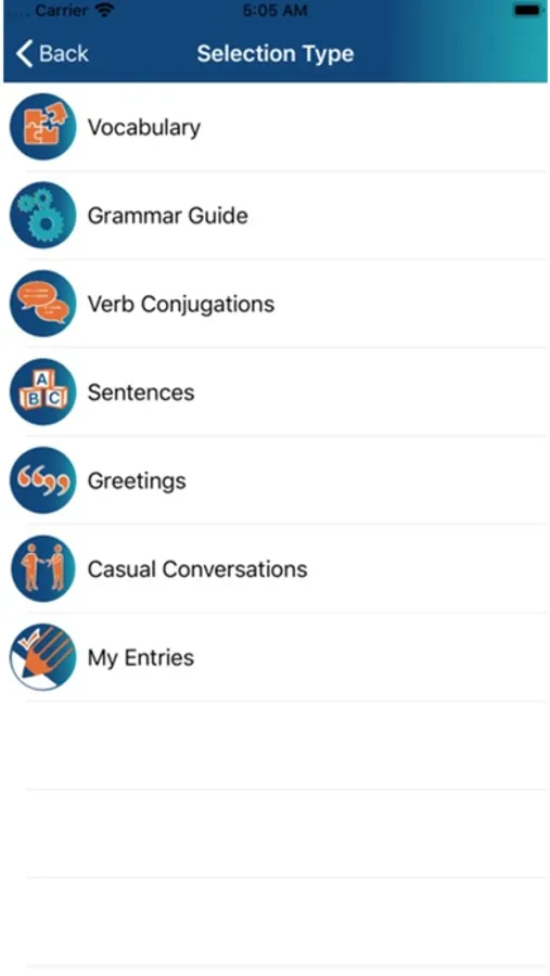 The content is identical in each of the 12 languages and is arranged in categories. Practice verb conjugations, greetings, common topics of conversation and grammar points.