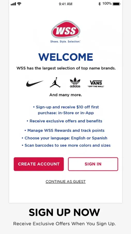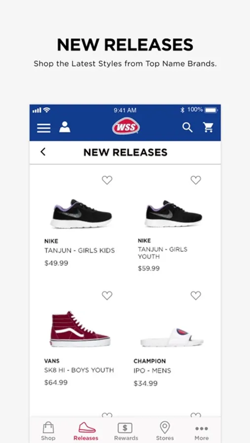 The WSS Rewards App is your source for all your shoe needs. WSS has the largest selection and best values on athletic and casual footwear for the entire family. Shop thousands of styles from top name brands like Nike, Jordan, adidas, Vans, Converse, PUMA, and more!