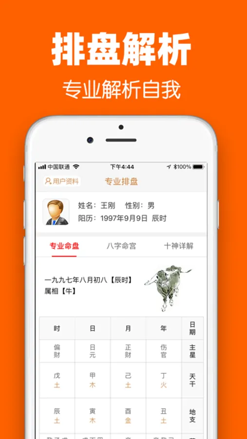 2,专业排盘:包括专业命盘,八字命宫,十神详解,让你更清楚的知道你的天干地支、吉神凶煞、交托日期、十二星运、大运流年等。