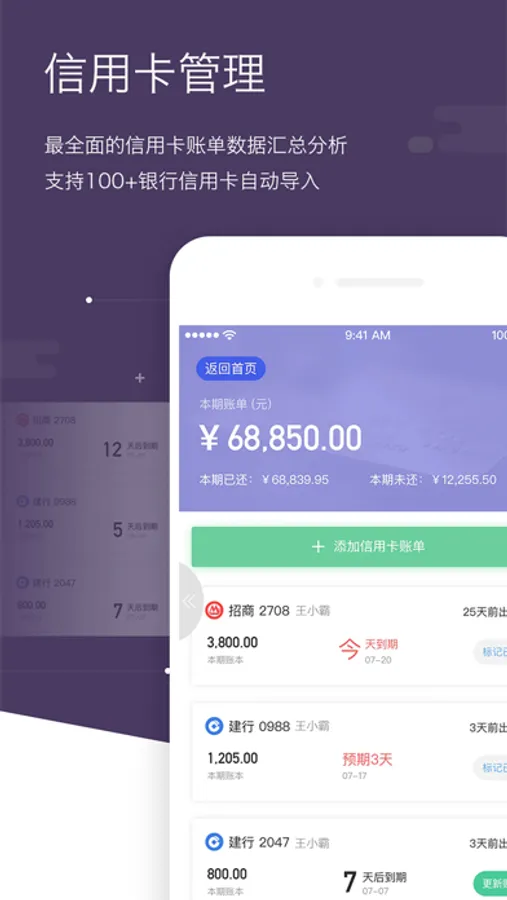 支持100+银行信用卡账单管理,自动导入,账目清晰,操作方便