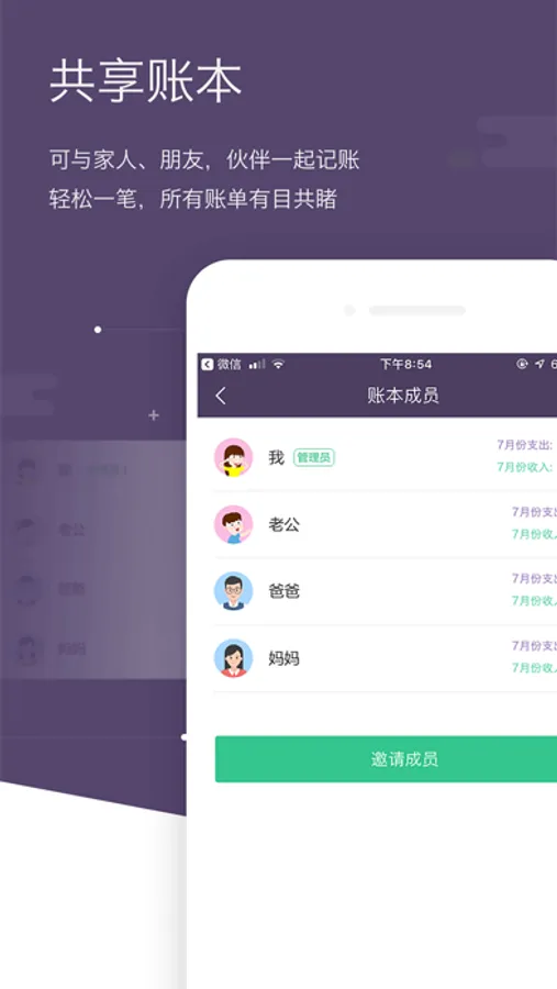 一键邀请家人、朋友、同事共同记账,账单实时同步。
