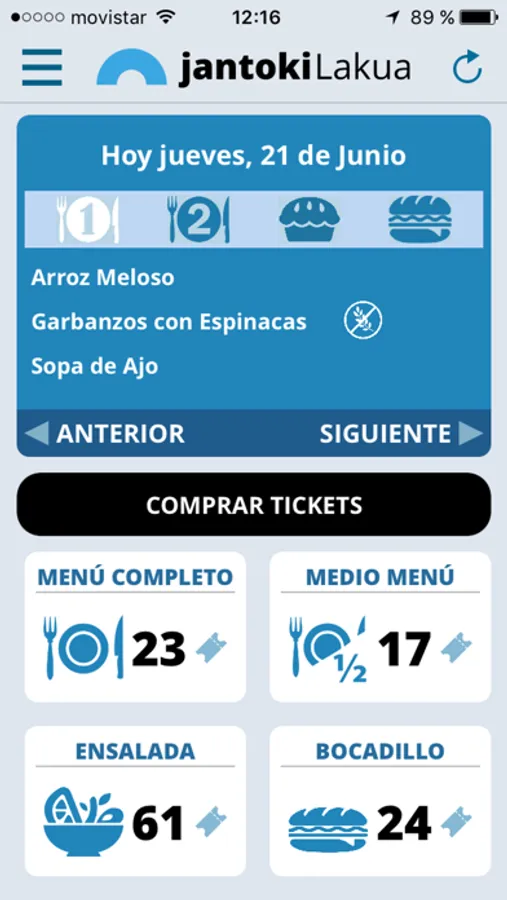 Lakuako Eusko Jaurlaritzaren jantokiko erabiltzaileentzako aplikazioa. Eusko Jaurlaritzaren Ordainketa-Pasabide bidez tiketak erostea ahalbidetzen du; ondoren, Tiket horiek jantokian bertan menuengatik trukatuko dira.