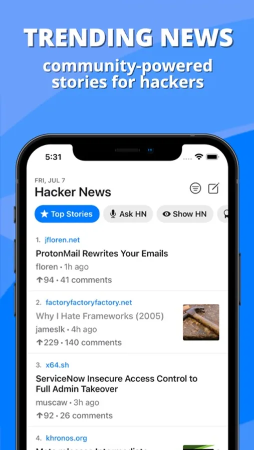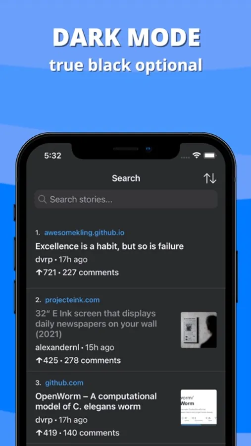 • CUSTOMIZE YOUR NEWS FEED: Tap or swipe between story filters such as 'Top Stories', 'Ask HN', 'Show HN', 'Best Stories', 'New Stories', and 'Jobs'. Rearrange them to your desire.