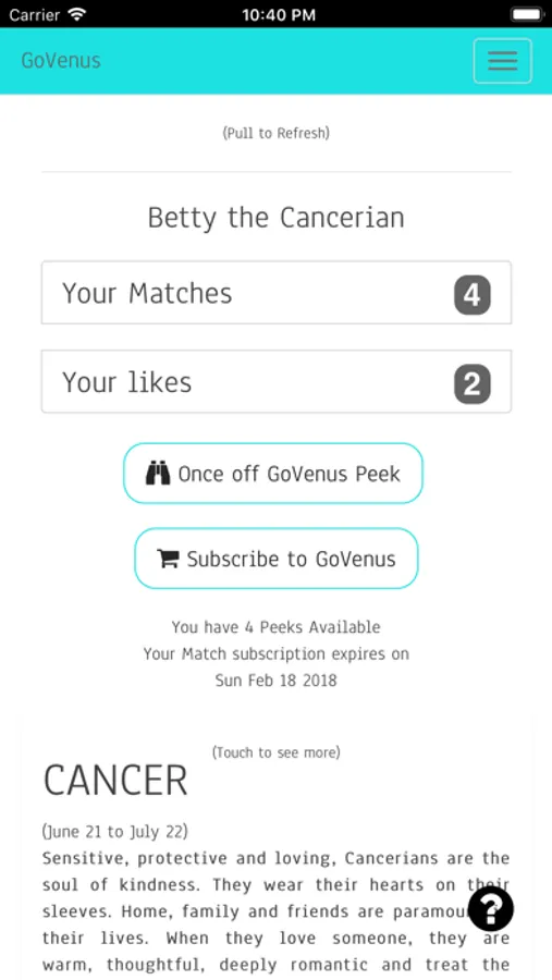 Register and subscribe to this easy-to-use way of meeting compatible people. This not just another dating site - GoVenus applies the principles of astrology to help you find a suitable matching potential partner.
