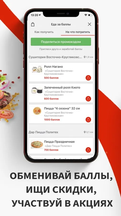 - Накапливать и тратить бонусные баллы на вкусные блюда;