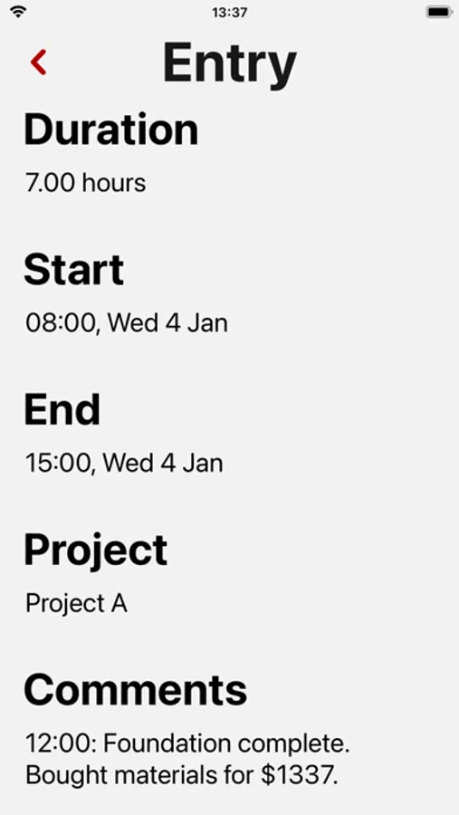 When clocking in, the app starts a timer and records the GPS coordinates. When clocking out, the app submits the tracked time and the final GPS location. Comments and images can also be recorded to keep notes, track costs, or to document progress. Location tracking is optional.