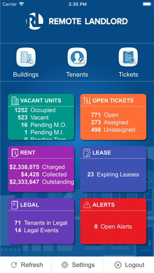 App for Remote Landlord software system for use by property managers to track tenants, tickets, vacant units, and more.