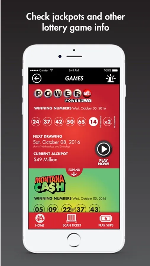 The official Montana Lottery app has everything a lucky Montana player needs. Scan your tickets to see if you won. Create and save playslips with your own lucky numbers to scan into real tickets at a retailer. Scan your Bonus Play codes and enter them immediately into our exclusive Player's Club drawings. Play our Player's Club games for more chances to win. Find out the latest winning numbers and jackpots on all our popular games, including Montana Cash, Powerball, Big Sky Bonus and more!