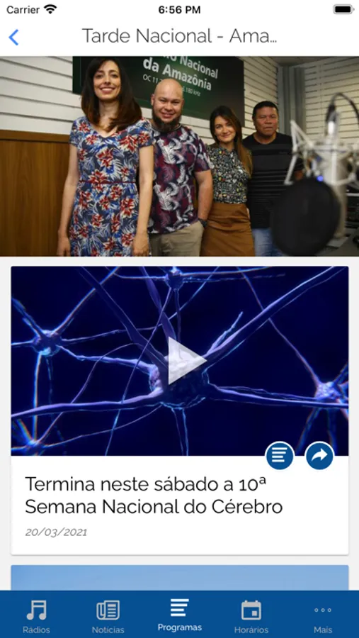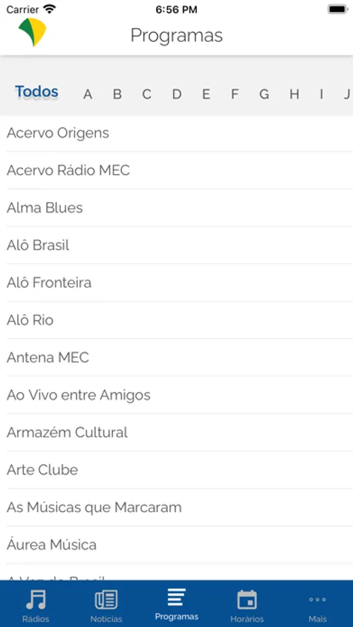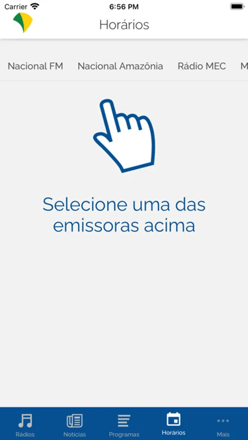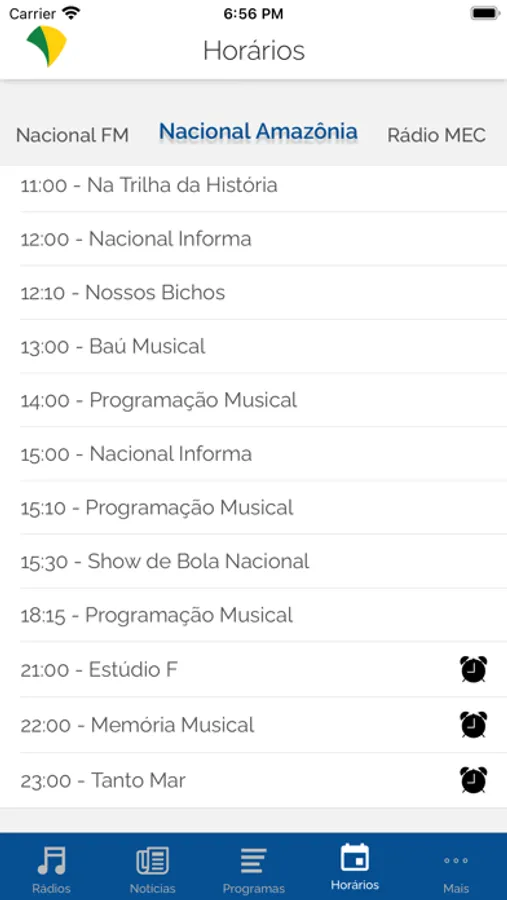 No menu programas além de saber tudo que cada rádio oferece, você ainda tem a possibilidade de agendar uma notificação para que o app te avise quando for começar o programa que deseja ouvir a partir do menu horários.