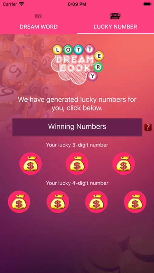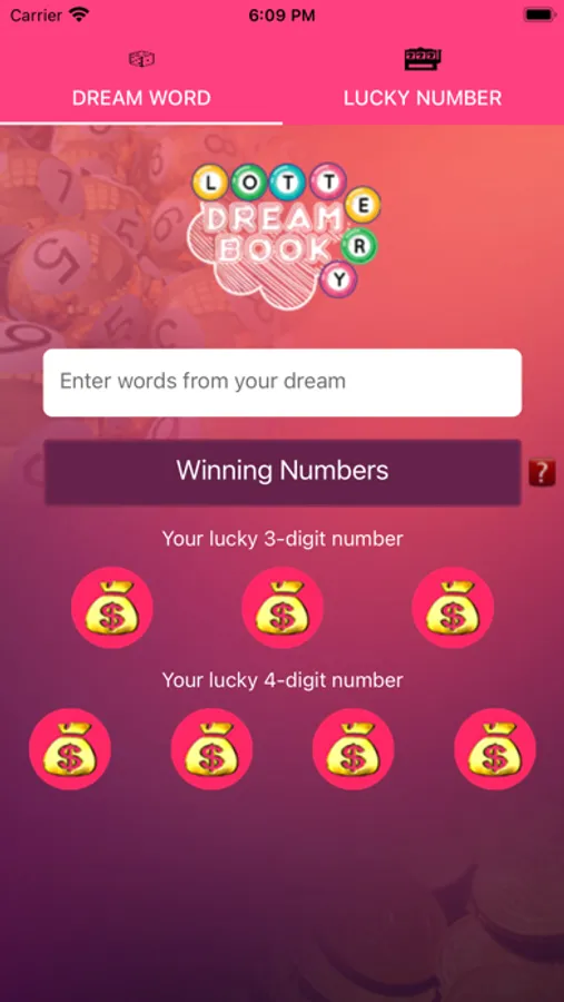 This app is designed to provide you options to enter words from your dream or have random numbers generated for you.