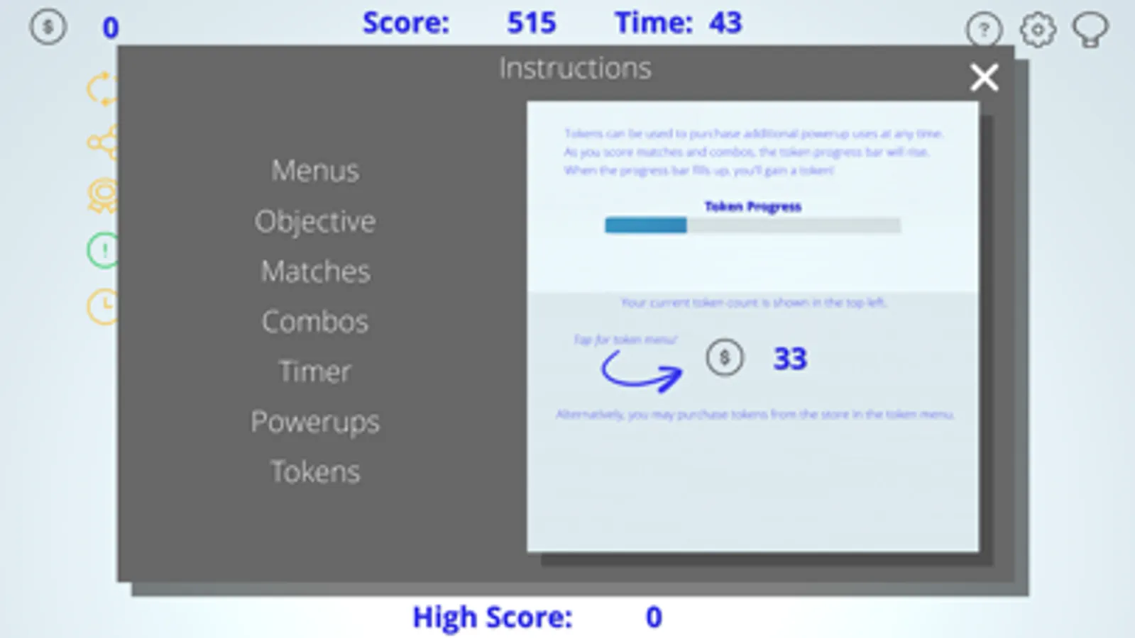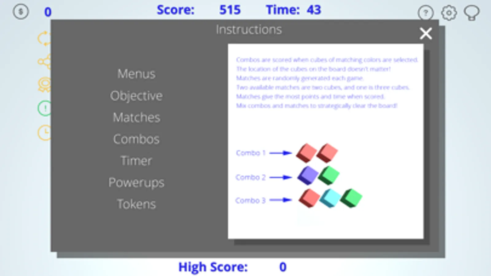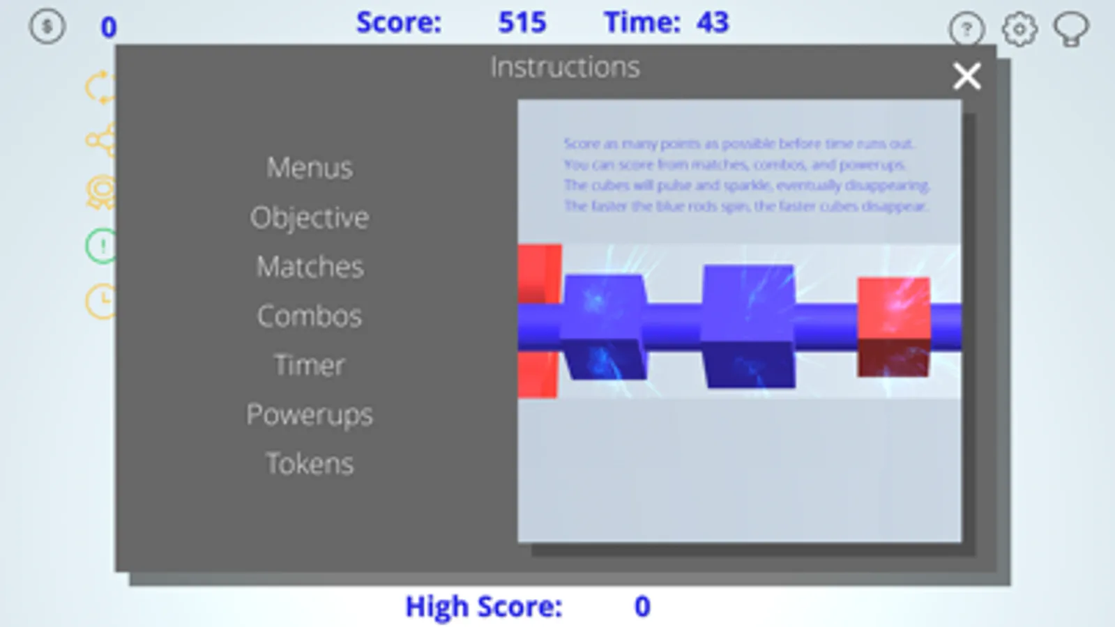Cubic Chaos is an exciting puzzle game for those that like fast-paced cube-crushing action! Select any three cubes of the same color to score a match, or go for the two- or three-cube combos for more points and time gains. Discover the utility of strategic power-up use as you min-max your way to a high score. Make sure not to linger, though, as the cubes disappear the faster they spin! All the while, the timer continues to draw closer to zero.