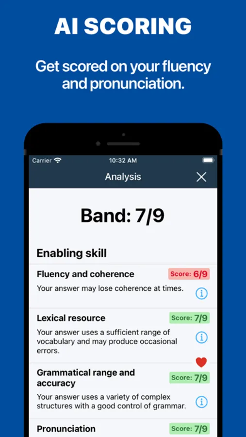 Get insights on your IELTS Speaking skills such as content, pronunciation, oral fluency as well as grammar, spelling mistakes and vocabulary for your IELTS writing exercises.