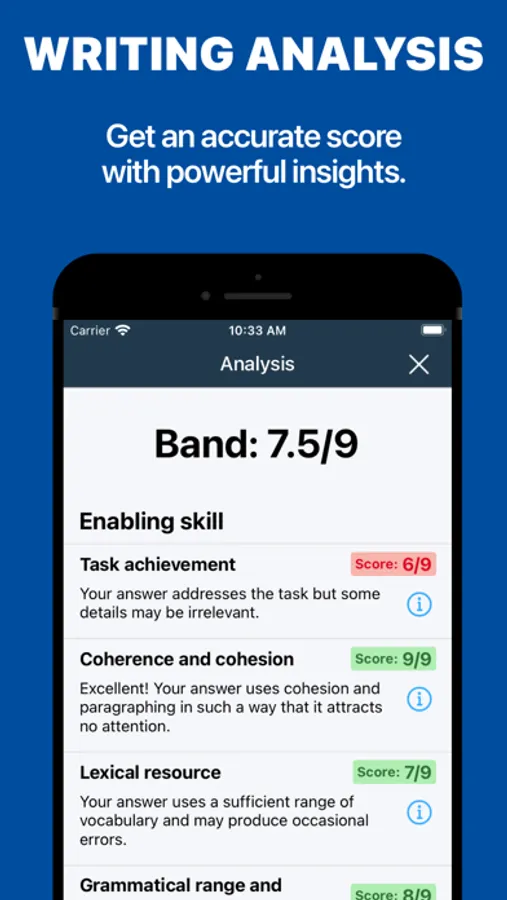 IELTS Success App reproduces the British Council official IELTS score guide to make sure you get accurate and reliable mock test results.