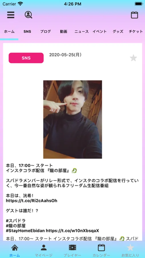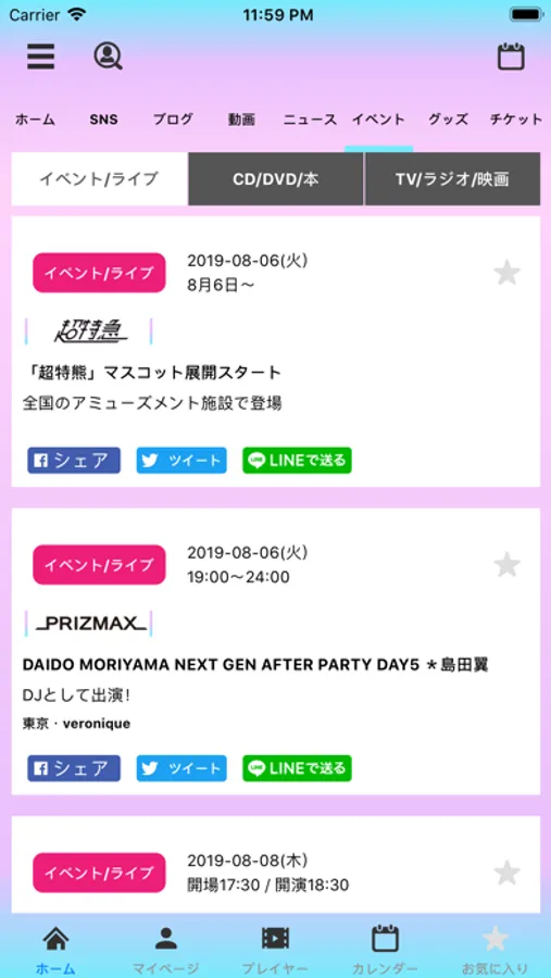 ・メンバーやスタッフのSNS書き込み、ブログ、ニュースサイトでの記事などもフィード表示。リアルタイムな情報も見落としません!