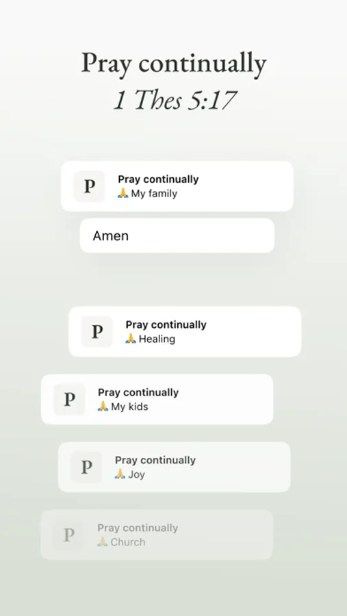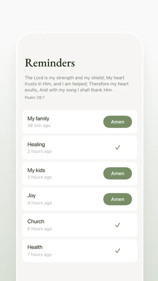 - Tap ‘Amen’ after you have prayed for each reminder and keep track of how many times you’ve been praying for each prayer in your list