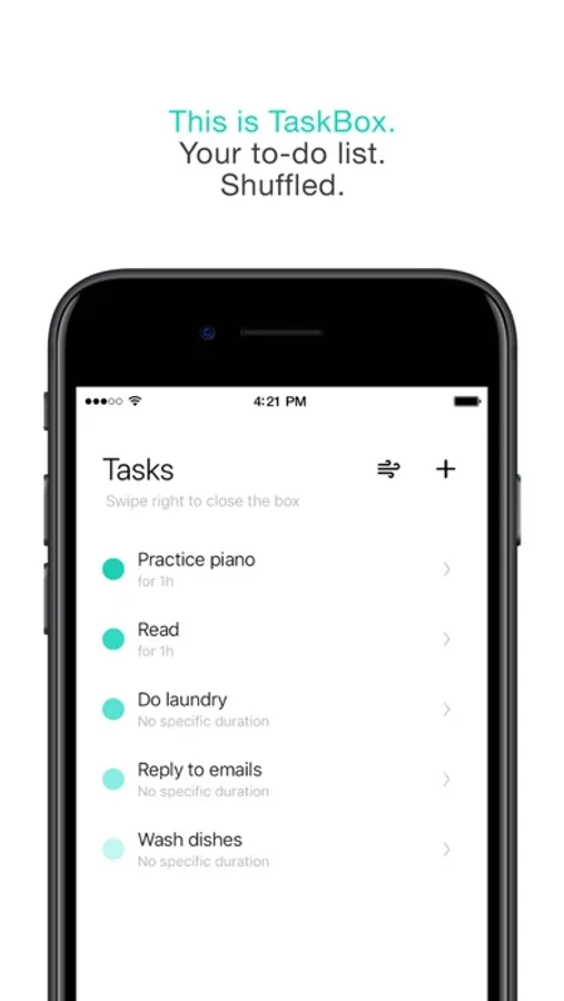 Overwhelmed by a lot of work or don’t know where to start? Have TaskBox shuffle and select tasks for you to do.