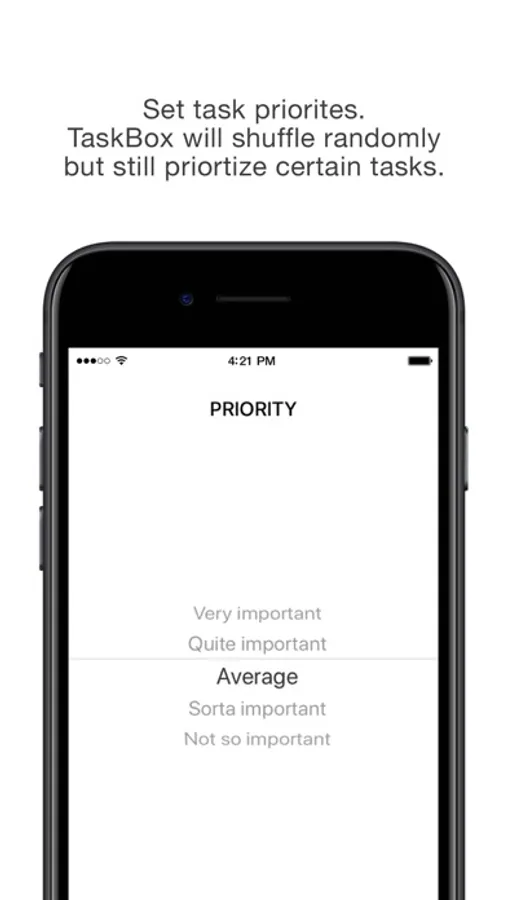 TaskBox’s unique algorithm allows weighted shuffling. With priorities set on your tasks, higher priority tasks will have a higher chance of being selected for you to complete first.