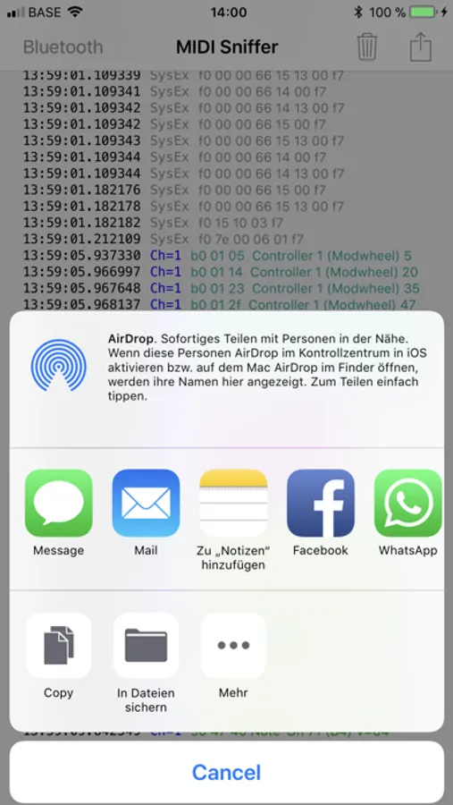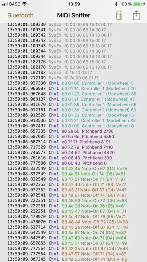 This app allows you to capture incoming MIDI (Musical Instrument Digital Interface) messages, for example from external instruments. It is also possible to share the entire log, for example with app developers asking for a MIDI dump.