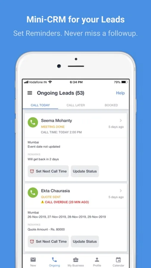 Now you can set reminders to call customers so that you never miss a follow up. You can update the status of leads and manage them in various stages from - New, Quote Sent, Meeting Done to Booked! Basically it's all you need to make the most out of your leads and ensure great lead-to-booking conversion.