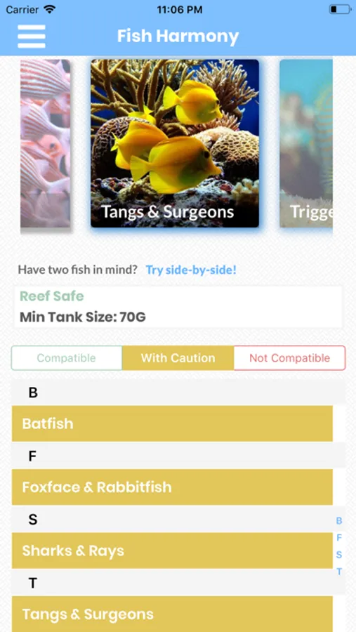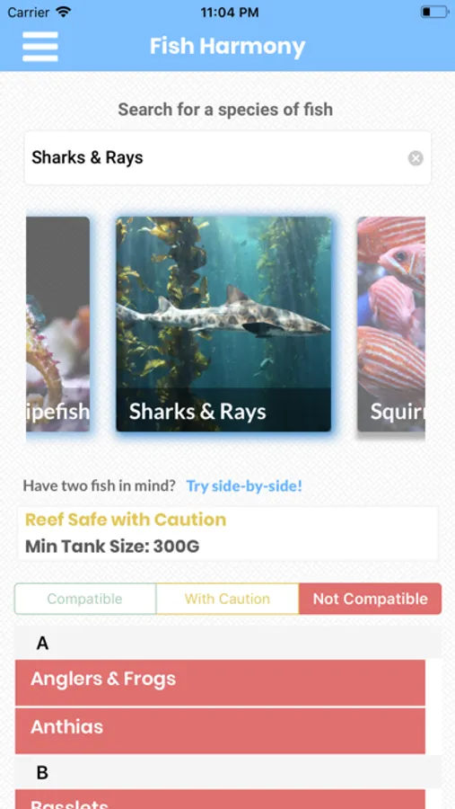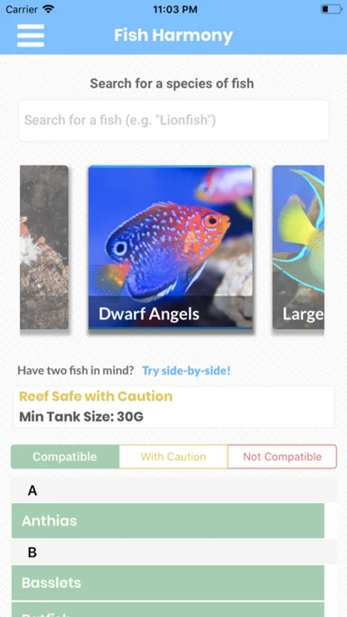 Fish Harmony is meant to give comprehensive compatibility data for every type of aquarium fish. Not sure if a lionfish is compatible with a clownfish (hint: it isn't)? Fish Harmony will also let you know if that kind of fish is Reef Safe, Reef Safe With Caution or Not Reef Safe (in saltwater mode only, obviously!), to prevent your coral from being munched on!