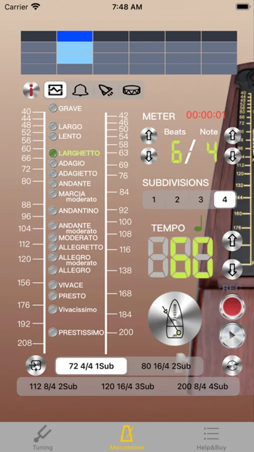 - Intuitive beat mode selection, 18 types, including: Grave 25-45 / Largo 40-60 / Lento 45-60 / Larghetto 60-66 / Adagio 66-76 / Adagietto 72-76 / Andante 76-108 / Andantino 80- 108 / Marcia moderato 83-85 /Andante moderato 92-112 / Moderato 108-120 / Allegretto 112-120 / 116-120/ Allegro 120-156 / Vivace 156-176 / Vivacissimo 172-176 / Presto 168-200 / Prestissimo 200 Bpm and over