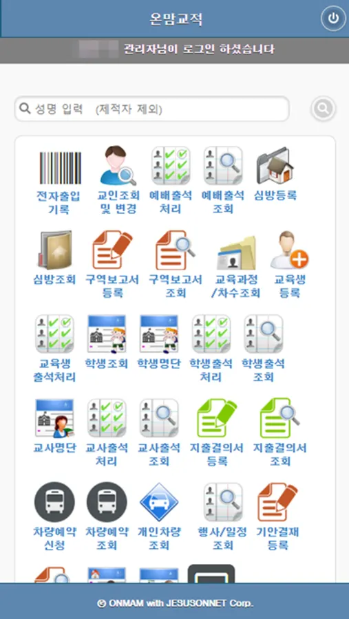 운영자 권한에 다라 교적관리, 목회관리, 교회학교 관리, 행정관리, 조직관리 등을 확인 및 변경하실 수 있습니다.