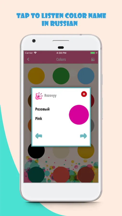 This Learn Color Names in Russian is the best app to learn Russian language. It will allow you to repeat each color name as many times as you like until you thoroughly learn them. The clear voice of a Russian native speaker will serve as your guide to correctly pronounce each color name.