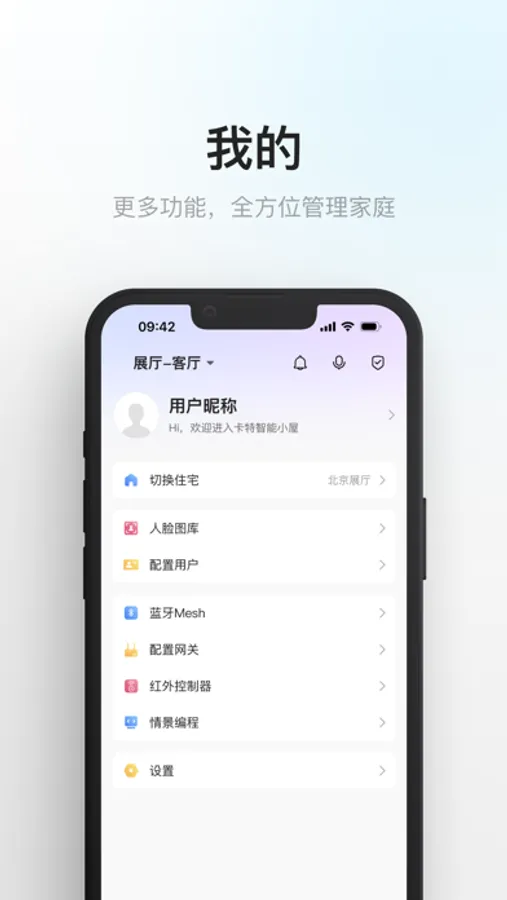 让场景定时,像闹铃开关一样简单,卡特加特智能家居让场景可以按照日常生活方式、工作习惯设定丰富的定时功能;同时我们考虑了每位家庭成员的不同生活方式,在手机控制软件上不同区域区分不同人员的操作,每位家庭成员都有自己的智慧生活方式。