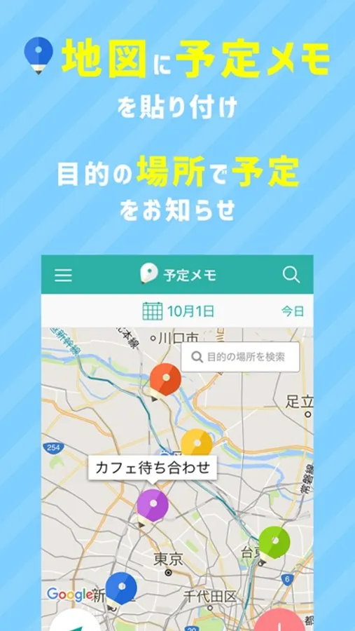 マップ上にメモやToDoリストを貼り付けることで、メモの場所に近づいた段階で、予定をリマインダーで通知してくれます。時間が決まっていない予定やスケジュール忘れの防止にとても便利です。