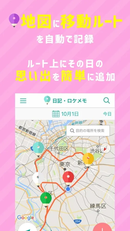 毎日移動したルートを自分だけのマップに自動でプロットしてくれます。その日の行動がすぐ思い出せるので、記憶に悩まず日記や手帳を付けることができます。また、移動ルート上の地点に個別に思い出(ロケメモ)を書くことも可能です。