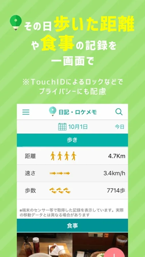 このアプリはアップル ヘルスケアのデータを利用し、毎日の歩数、アプリで記録された距離から、歩行速度など自動的に付けてくれます。朝・昼・夕の食事に合わせて登録すれば、一画面で日々のヘルスケアに役立てられます。