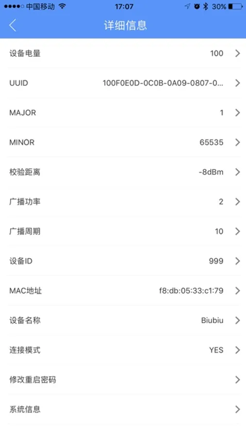 Modify parameters, such as UUID, Major, Minor, Tx Power, Broadcast name, Password etc.