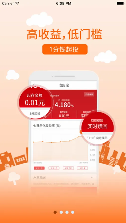如E宝:货币基金,一分起投,收益稳健,随用随存。