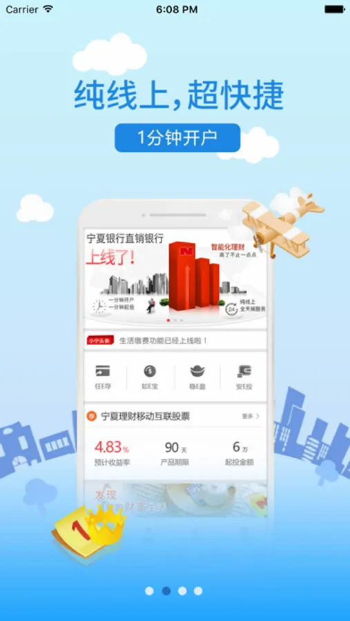 宁夏银行直销银行是互联网时代下的新型互联网银行,客户无需前往营业网点办理实体卡,就可通过直销银行客户端自助在线开立专用II类账户,通过绑定账户办理资金转入转出、智能存款、投资理财、货币基金、债券基金、信用卡还款、自助缴费等业务。严格的风控管理、完善的电子账户安全体系、7×24小时不打烊的陪伴、纯线上快捷方便的操作、高收益的产品和贴心的生活服务,宁夏银行直销银行竭诚为客户提供更便捷、更优惠、更贴心的金融服务。