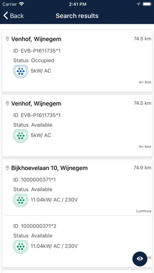 Search by city, zip code or charging station number. Use the search list for an overview of the charging stations that are currently available to you.