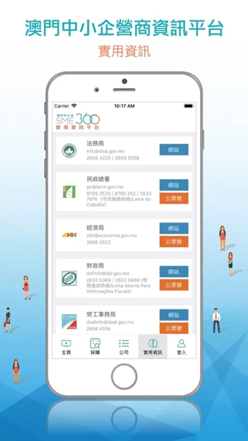 提供本澳各個與中小企有連繫的政府部門的聯絡方式,如電話、傳真、網站及微信公眾號等資訊。