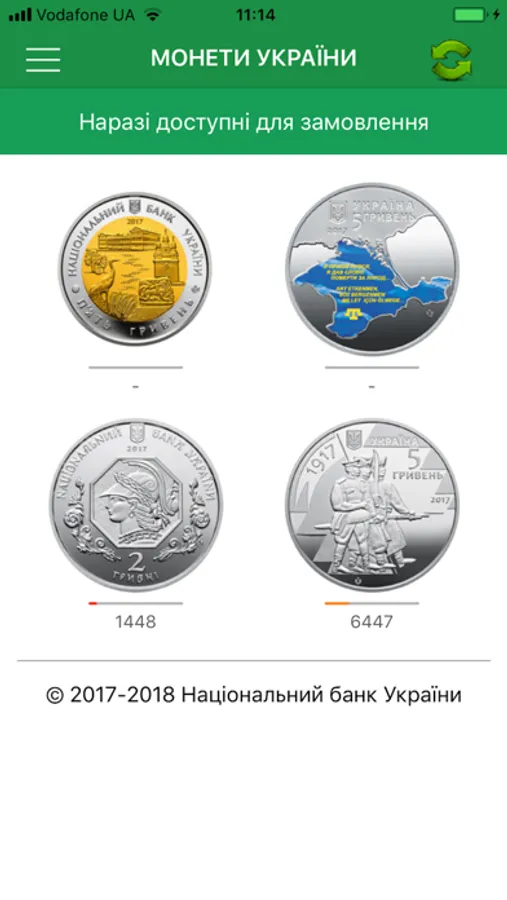 Додаток надає можливість оперативно відслідковувати залишки монет на сайті online замовлення Національного банку України (доступний в меню) в розрізі областей.