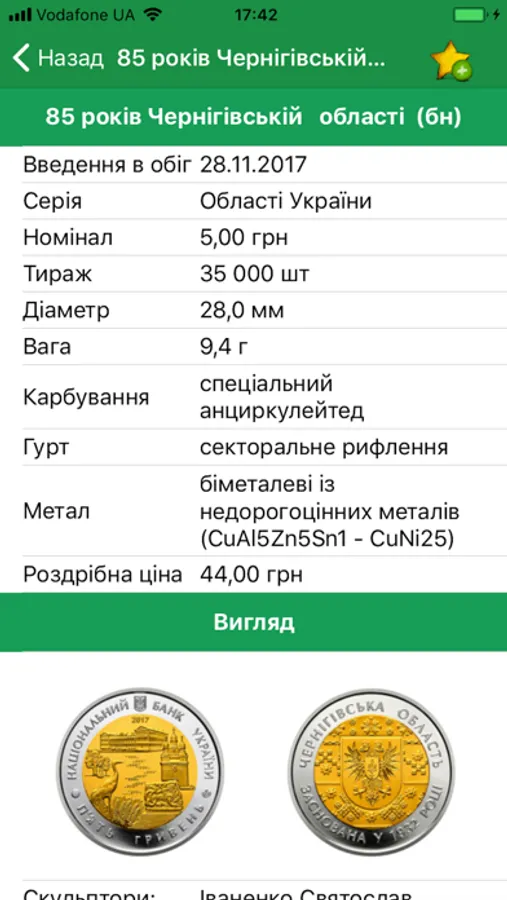 Користувач отримує доступ до повного довідника монет України з переглядом технічної інформації, зображення, опису, роздрібної ціни. Можливий пошук в каталозі за назвою або перегляд монет за серією, роком введення в обіг.
